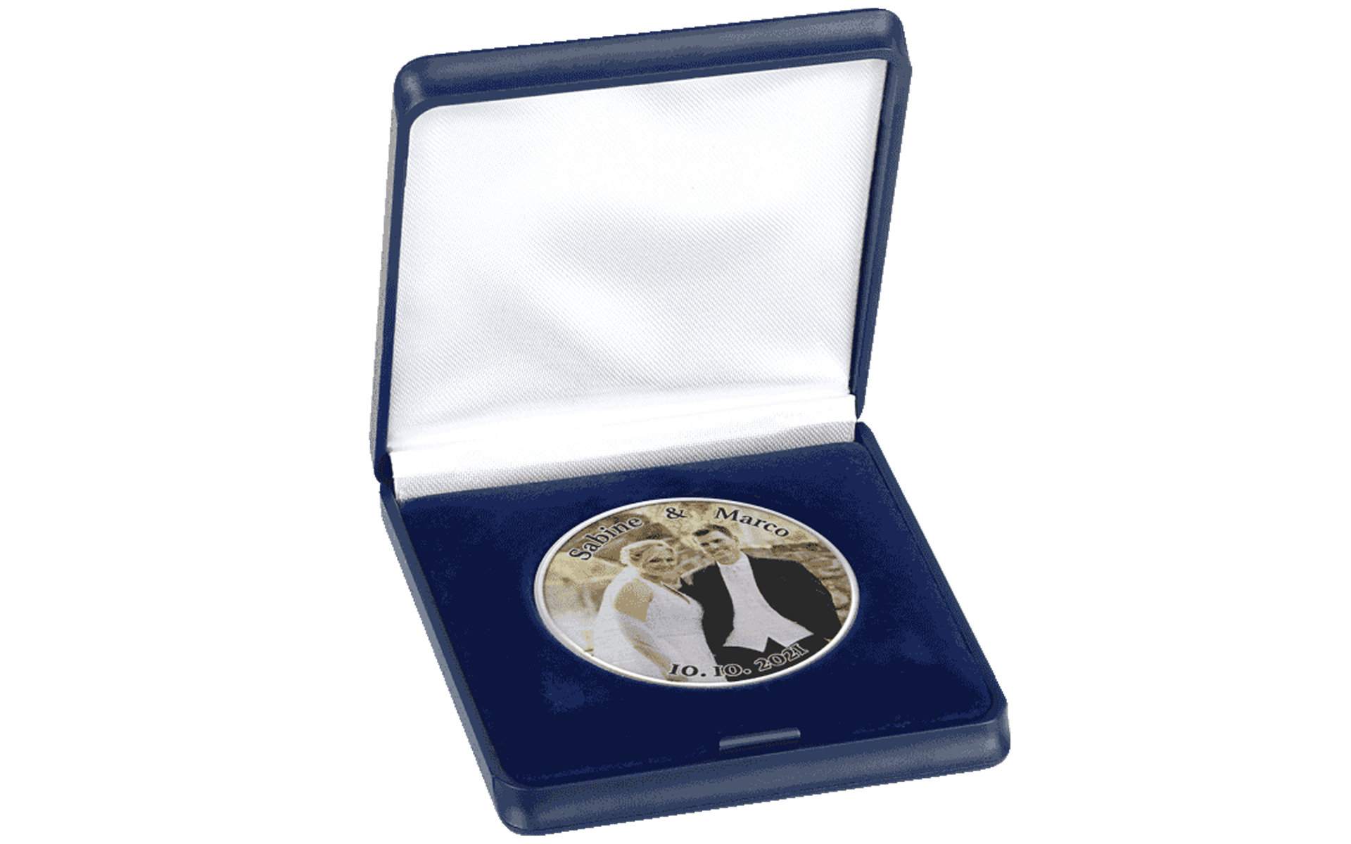 Unsere fein gebürstete Jubiläumsmünze aus 925 Sterlingsilber (massiv, Durchmesser 40 mm, Dicke 2 mm, ca. 25g) personalisiert mit einem lasergravierten Foto oder Motiv und einer Textgravur. Ideal für Taufen, Geburtstage und Pensionierungen. Sie haben einen Sonderwunsch? Kein Problem, wir beraten Sie gerne!