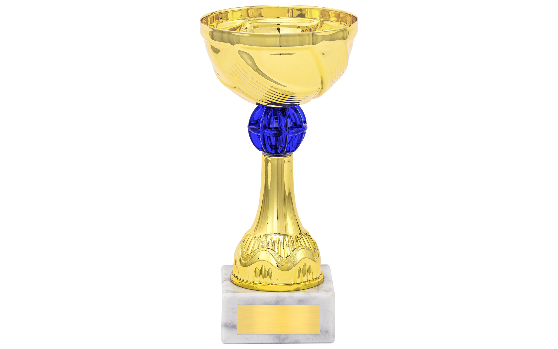 Unser Pokal JASPER mit blauem Mittelteil kombiniert einen goldfarbenen Kelch mit einem kräftigen Blau, das sofort ins Auge fällt und jede Auszeichnung besonders macht.