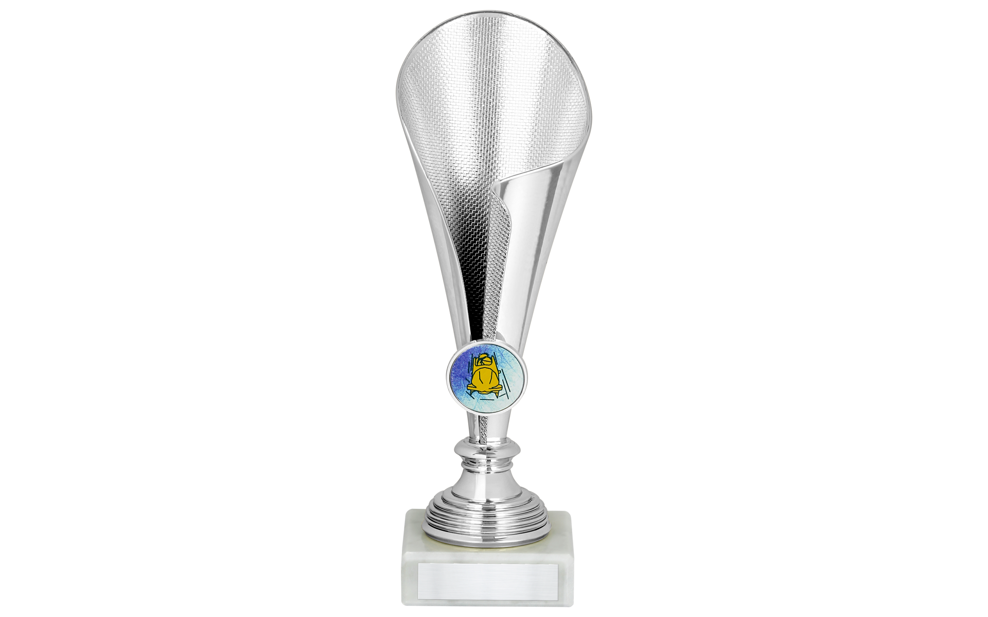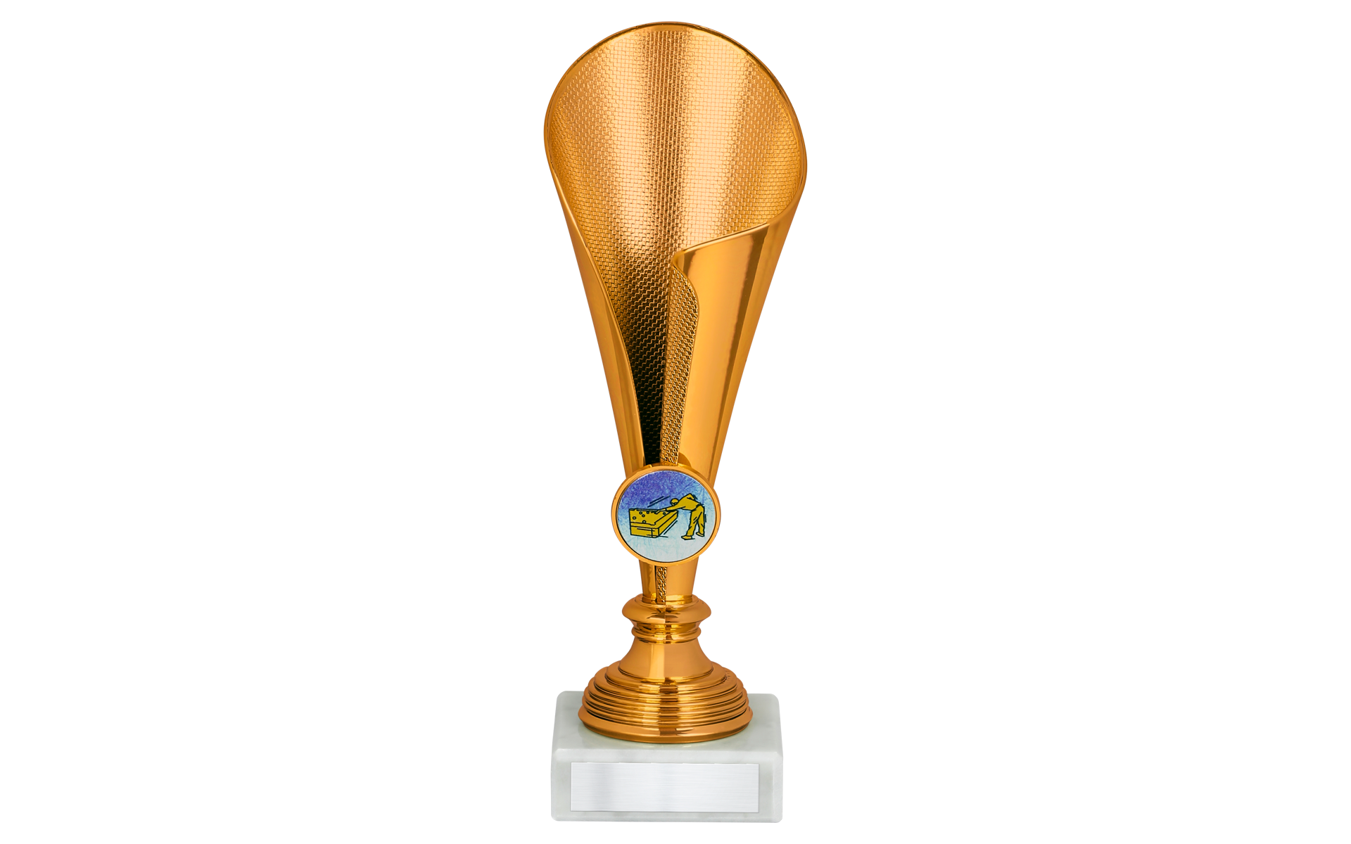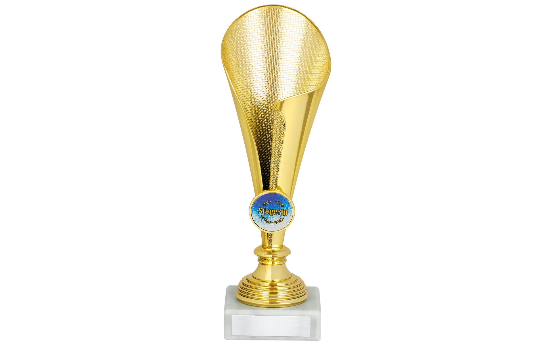 Ein Kunststoffpokal in Gold für coole Sieger mit einem Champion Emblem.