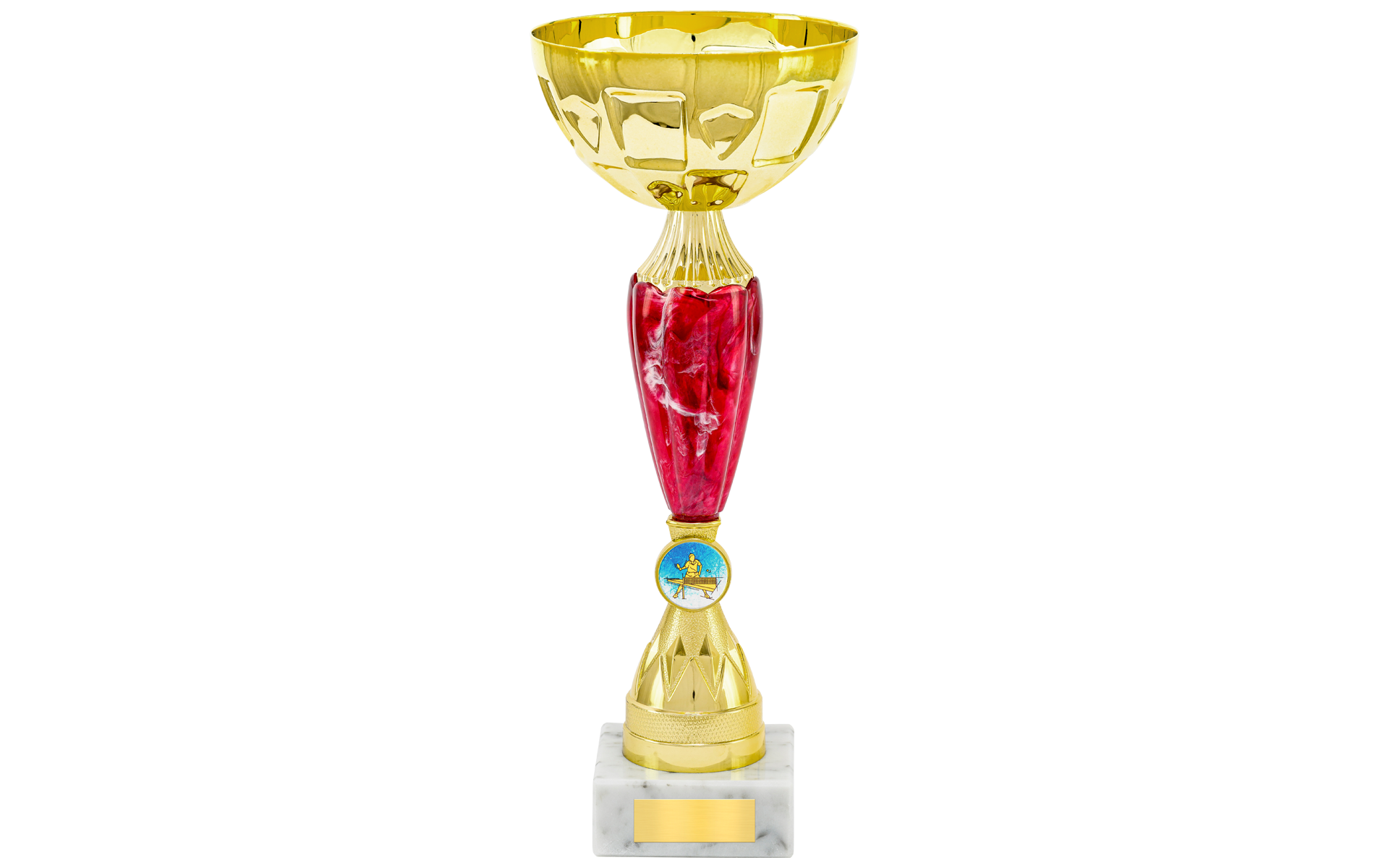 Dieser goldene Pokal mit dunkelrotem Mittelteil verbindet edles Design mit einem kraftvollen Farbakzent und zieht alle Blicke auf sich.
