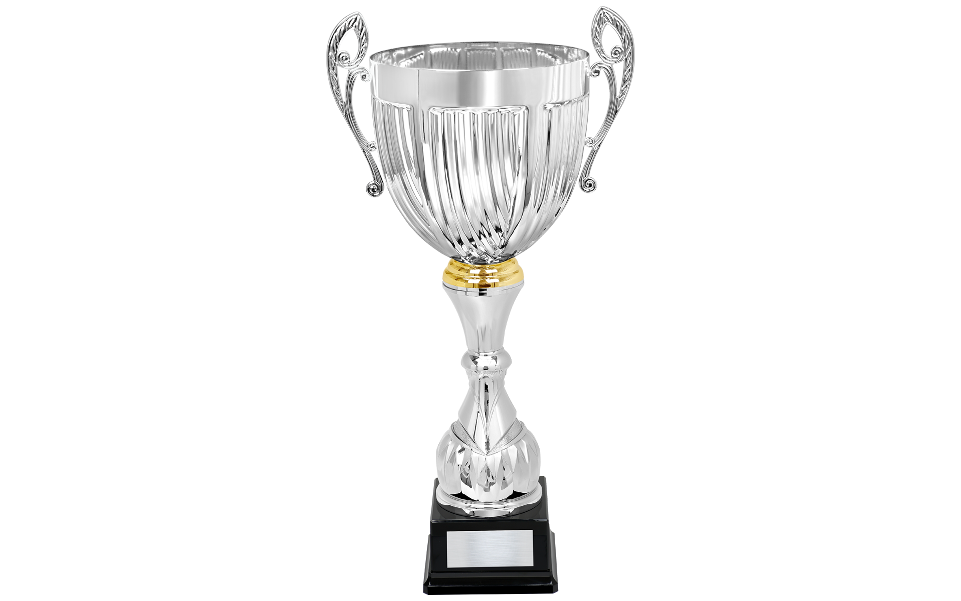Schön gehämmerter Henkelpokal mit Farbakzent.
